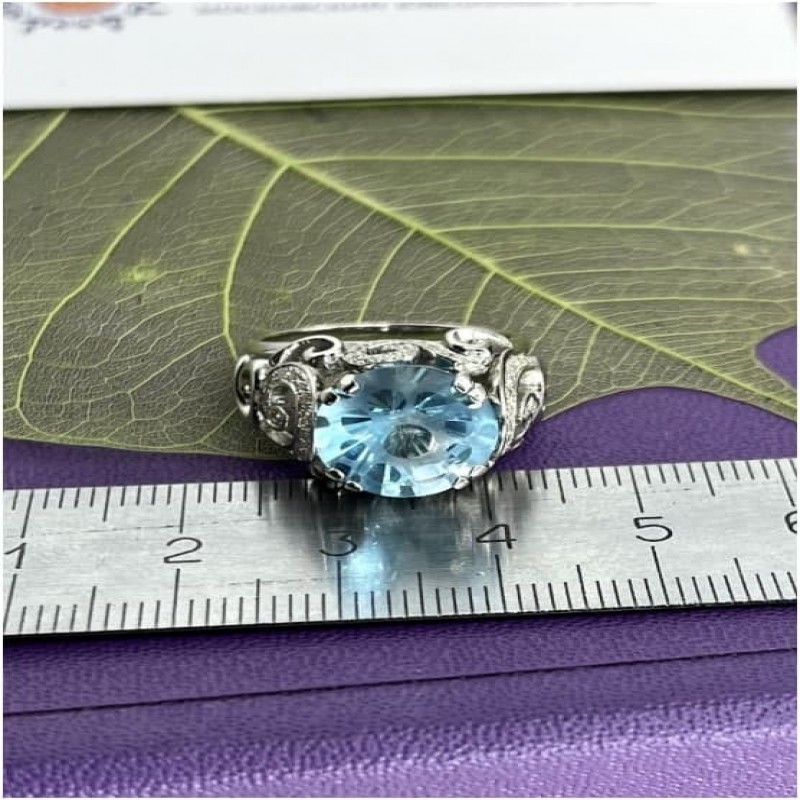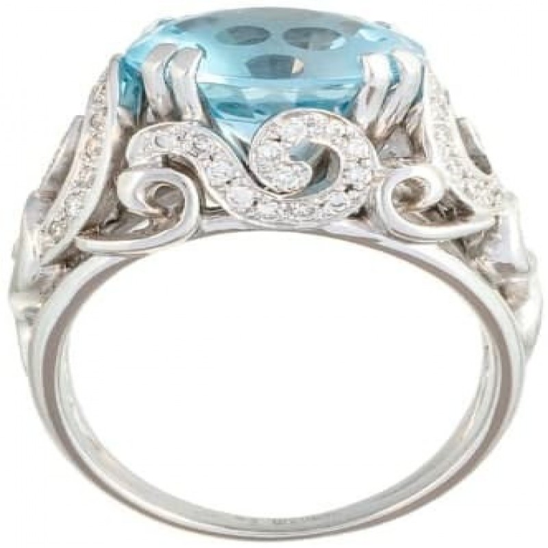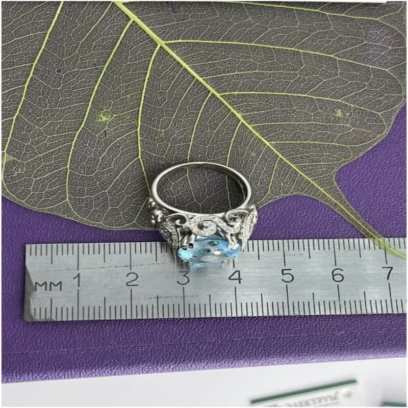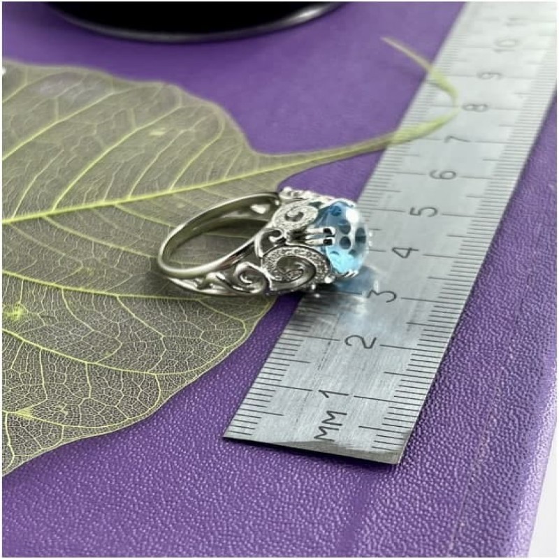 Anello da donna grande ma delicato "Zavitki", realizzato in oro 585 con topazio blu in una esclusiva lavorazione a Punti* o Fungo* e diamanti. I riccioli si trovano su tutto l'anello, tranne che nella parte inferiore della fascia. In alcuni brillano sentieri di pietre, conferendo un ulteriore splendore al gioiello. L'anello nella parte superiore ha una larghezza di 13 mm e i riccioli sostengono il Fungo, che ha un diametro di 12 mm. L'altezza dal dito è di quasi 10 mm. La larghezza dell'anello nel punto più stretto è di 2,5 mm. Incastonatura di pietre semipreziose e preziose naturali di topazio e diamanti (Diamanti ALROSA, Yakutia): 58 brl Kr-57 0,440Ct 3/5 ,1 tpz KabBrl 6,480Ct, peso 10,25 gr.