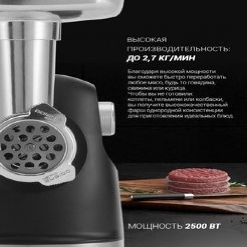 **Tecnologia PROTech: aumenta la coppia e migliora l'efficienza operativa. Tecnologia PROtect+: protezione aggiuntiva del motore contro il sovraccarico. Alta prestazione: fino a 2,7 kg al minuto!** Funzione di inversione. PROMETAL: sistema di fissaggio in acciaio. Piedini antiscivolo. 3 dischi in acciaio inossidabile: 3 mm, 5 mm, 7 mm. Vassoio in metallo per carne. Spingitore in plastica. Accessorio per la preparazione di salsicce. Accessorio per kebbe.