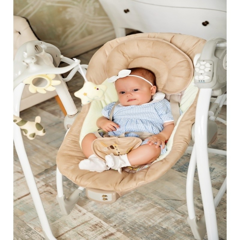 MIGLIOR AIUTANTE DELLA MAMMA - Flappy nuovo modello di altalena elettrica con VIBRAZIONE per i più piccoli da 0 mesi. La struttura dell'altalena si distingue per la sua semplicità e compattezza, il che apre ampie possibilità per il trasporto del prodotto e per creare un ambiente accogliente e domestico per il bambino ovunque. L'altalena elettrica 2 in 1 è sia un'altalena che una sdraietta. Per il massimo comfort del bambino, l'altalena elettrica prevede due posizioni dello schienale e 6 modalità di velocità di dondolio e vibrazione. L'altalena elettrica è dotata di un blocco musicale con la possibilità di riprodurre 12 melodie e vibrazione per cullare il bambino. La modalità di riproduzione individuale è impostata tramite un timer integrato e regolazione del volume. La tranquillità dei genitori è garantita da cinture di sicurezza a 5 punti. La copertura dell'altalena è realizzata in tessuto con proprietà antimacchia, la fodera è facilmente removibile per il lavaggio. Funzionano sia a rete che a batteria, per il blocco musicale servono 3 batterie di tipo C/LR14, per il blocco vibro servono 4 batterie di tipo C/LR14 Riduci descrizione