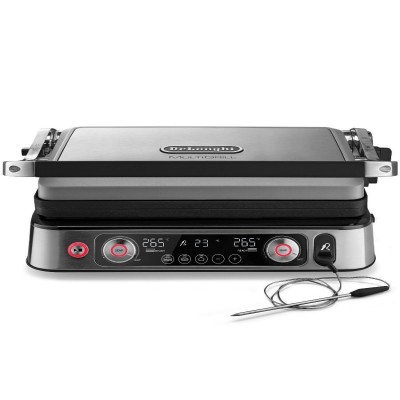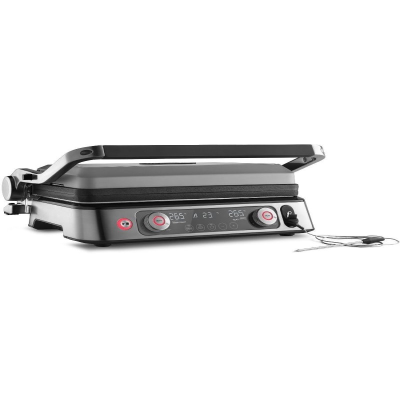 Griglia elettrica multifunzione DeLonghi CGH1112DP. Acquistando la griglia multifunzione CGH1112DP ottieni piatti perfettamente cotti grazie al controllo elettronico della temperatura con termostato indipendente per ogni piastra. Ogni piastra è dotata di un elemento riscaldante integrato, che garantisce una distribuzione uniforme del calore e un rapido riscaldamento della superficie. La griglia multifunzione è dotata di un termostato elettronico che reagisce immediatamente alla caduta della temperatura. Un sensore integrato misura la temperatura esatta del tuo cibo e visualizza le informazioni su un display a LED, permettendoti di controllare la sua temperatura interna e cucinare come preferisci! La funzione SEAR consente al piatto di essere perfettamente rosolato all'esterno, rimanendo tenero e succoso all'interno. Ideale per sigillare la carne nelle fasi iniziali della cottura. La temperatura della piastra raggiunge i 265°C. Riduci descrizione