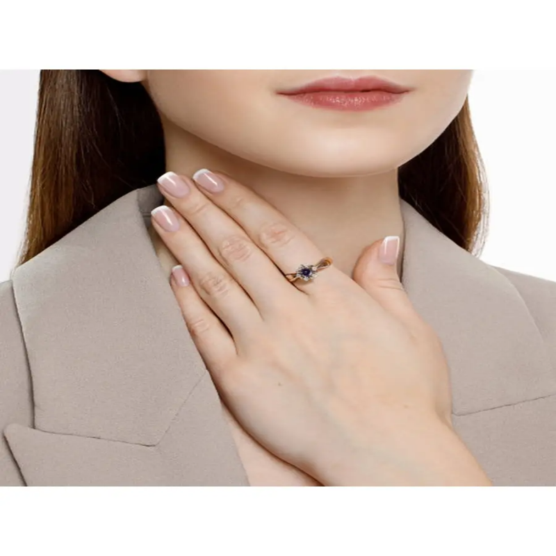 Anello da donna in oro con diamanti e tanzanite. Un elegante anello di design è perfetto per l'uso quotidiano e completa in modo spettacolare un look elegante, serale, festivo o da sposa. I gioielli moderni si abbinano facilmente a qualsiasi abbigliamento. I gioielli SOKOLOV (Соколов) vengono forniti con un'imballaggio regalo, perfetti per un regalo alla donna amata, alla fidanzata, alla ragazza per il compleanno, il Capodanno, l'8 marzo, San Valentino (14 febbraio) o qualsiasi festa e occasione. Il peso indicato nella foto e nelle caratteristiche è indicativo e può differire da quello reale. Il prodotto è realizzato in oro rosso 585; Pietra: diamante, tanzanite; Caratteristiche: 6 Br Cerchio 57 0, 129 3/6 A, 1 Tanzanite Cerchio 5, 00.