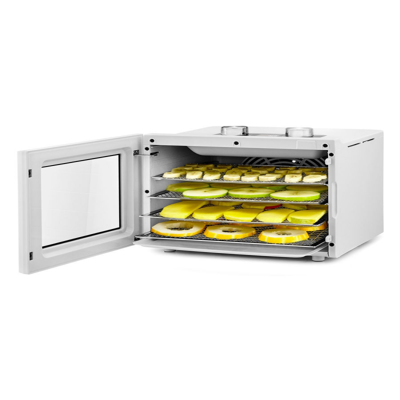 L'essiccatore elettrico è progettato per essiccare verdure, frutta, bacche, funghi, radici, erbe e verdure, nonché carne e pesce, pane. Con un apposito vassoio per liquidi è possibile preparare la pasta. L'essiccatore è dotato di 4 vassoi in acciaio inossidabile e 1 vassoio per liquidi. L'essiccatore è dotato di un potente elemento riscaldante e di una ventola di grande diametro, che garantisce una distribuzione uniforme dell'aria calda in tutto il volume della camera. Grazie al flusso d'aria orizzontale, la miscelazione degli odori durante l'essiccazione di diversi prodotti è minima. È possibile impostare la temperatura di essiccazione nell'intervallo 35-75 *C con un passo di 5 gradi. L'essiccatore è dotato di un timer fino a 24 ore di funzionamento con un passo di 1 ora. Riduci descrizione