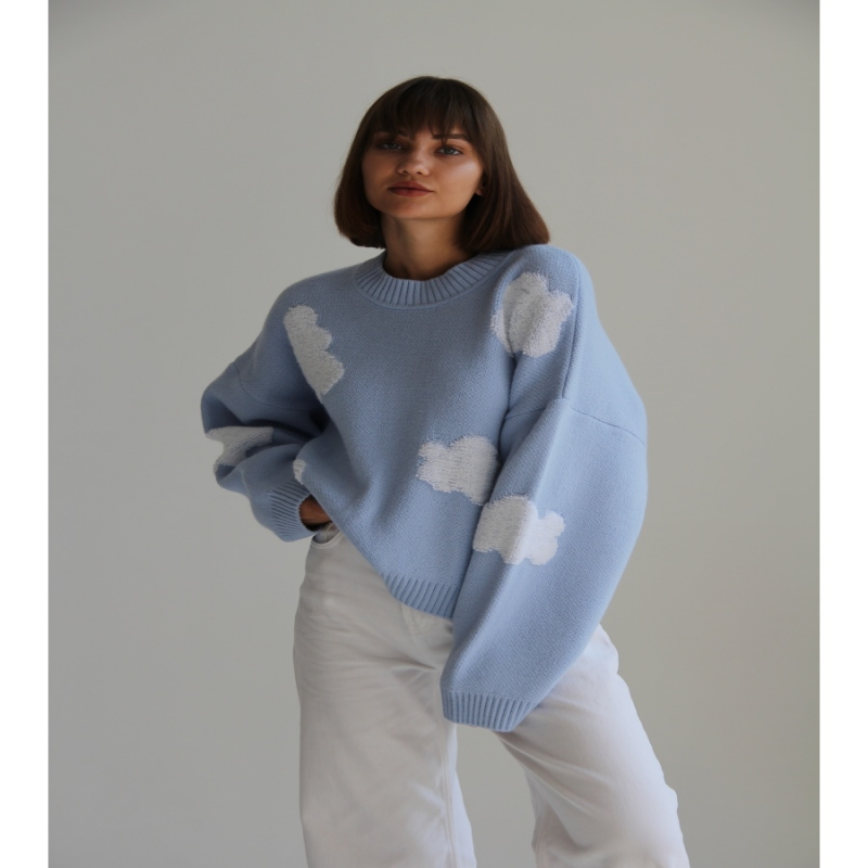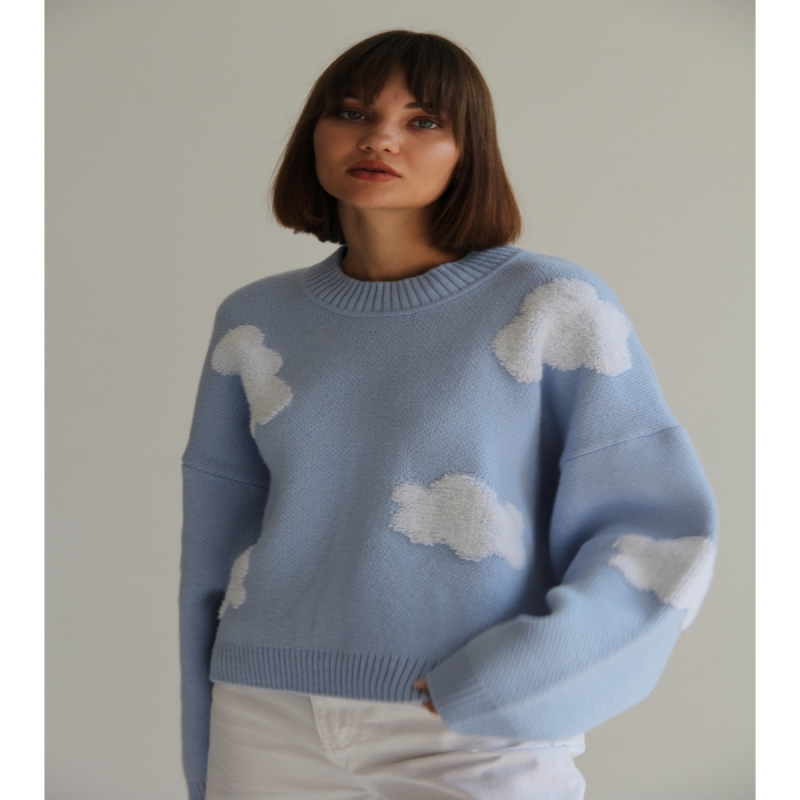 Il maglione è un capo universale. Il maglione oversize si inserisce perfettamente nello stile da ufficio, quotidiano e serale. Il pullover casual da donna renderà il tuo look insolito e unico. Maglione voluminoso di base con stampa alla moda Nuvole. Il caldo maglione in lana da donna ti terrà caldo durante l'inverno e in primavera. Il prodotto non perde forma durante un uso prolungato e i lavaggi. Il pullover a taglio dritto ha una taglia universale, si adatta perfettamente a tutti i tipi di figura ed è una parte indispensabile del guardaroba.